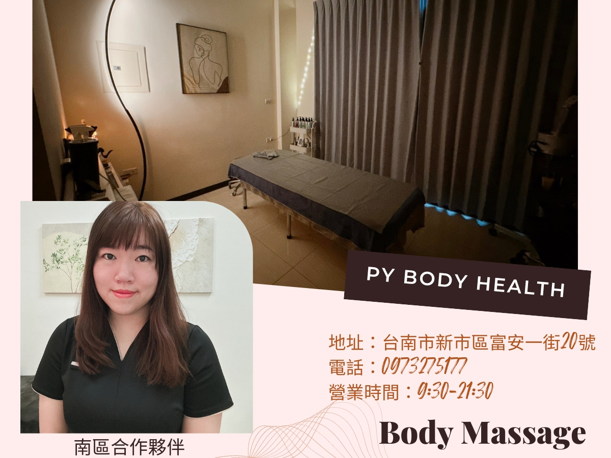 店名:PY Body Health 地址:台南市新市區富安一街20號 電話:0973275177 營業時間:9:30-21:30 官方line:https://lin.ee/m6BVxOB Facebook:https://www.facebook.com/PY.bodyhealth Instagram :https://instagram.com/py_body_health